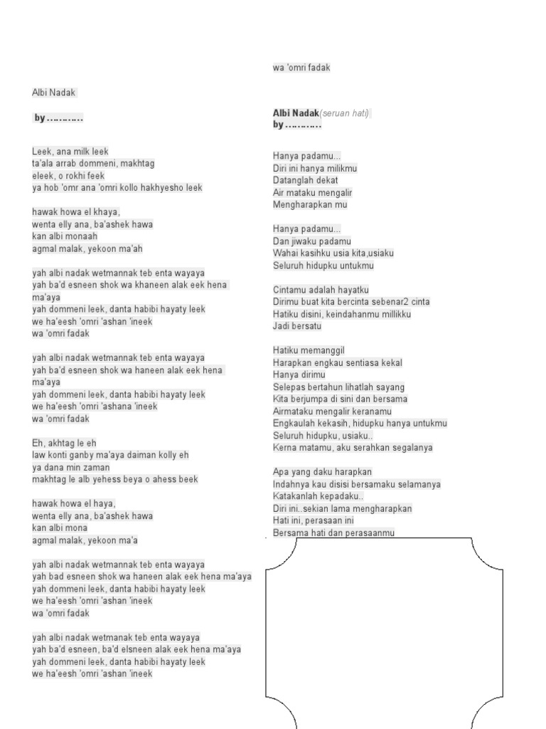 Liik ana milki liik Taala arrob dummini makhtaga liik Liik u rukhi fiik Ya hobba umrana umri kullu hakhyishu liik Hawak huwal hayah Wintall ana baashyak hawa Kaan albi muna. Tak ada chord dasar kunci gitar info dan lyrics lengkapnya baca di sini. Lirik Albi Nadak dalam bahasa Arab.